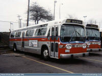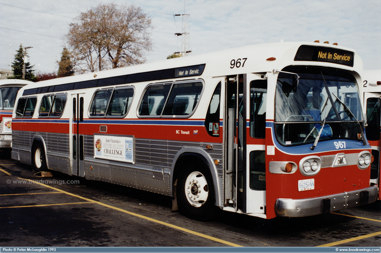 #965 is seen parked at the Victoria Transit Garage waiting for it's next run assignment in this shot taken in January 1992 by Peter McLaughlin. Beside #965, you can see 1981 T6H-5307N #843 which now currently operates for the Strathcona County Transit in Sherwood Park, Alberta as #912 which was purchased from Victoria in December 1999. | |