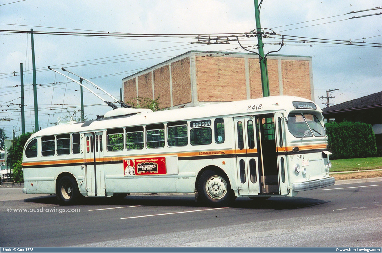 #2412 leaving the Oakridge Transit Centre on July 27, 1978. Photo captured by Peter Cox. | |