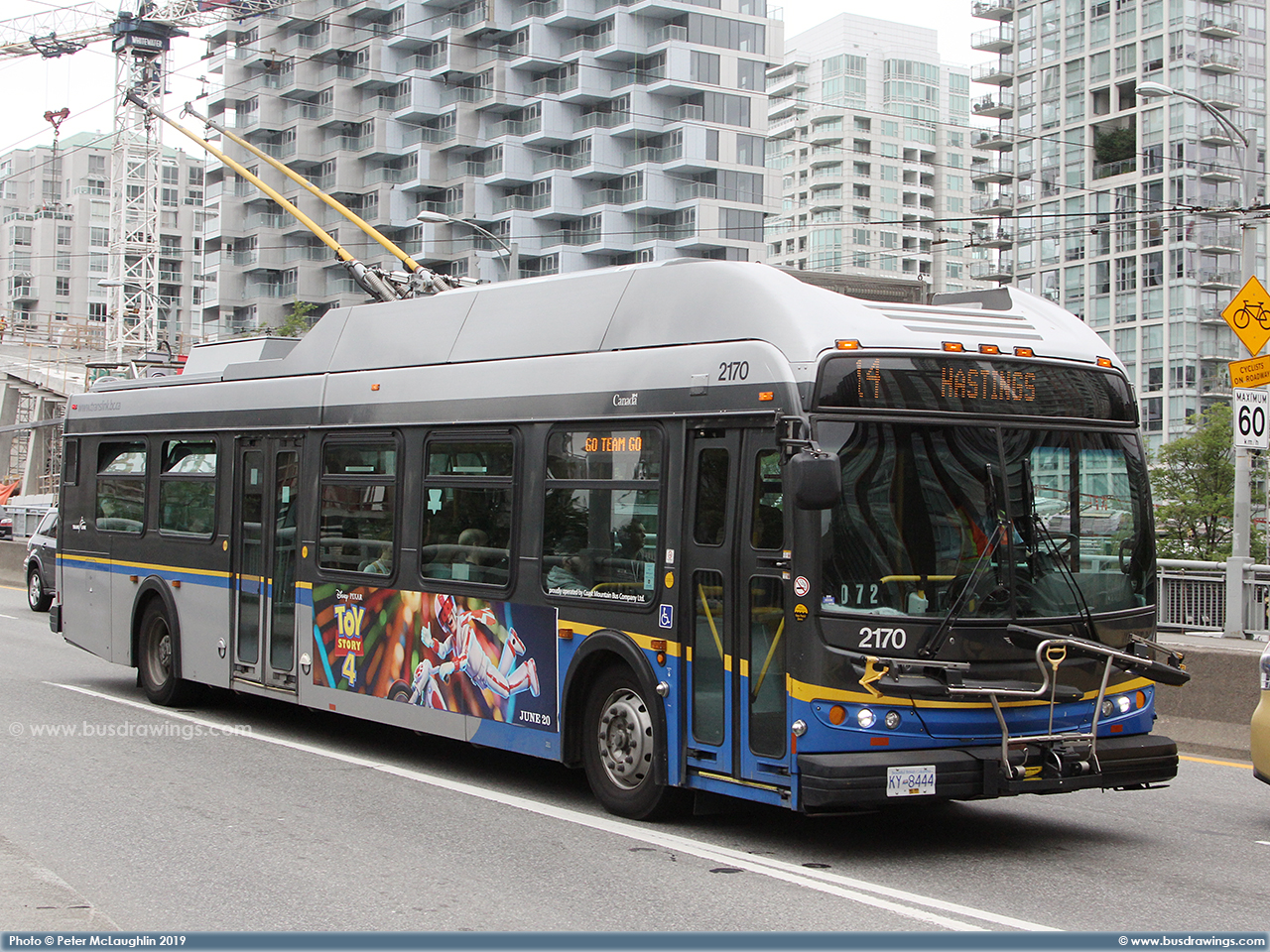 #2170 is seen Northbound on the Granville Street Bridge heading into the downtown core as a route 14 Hastings on June 14, 2019. Photo captured by Peter McLaughlin. | |