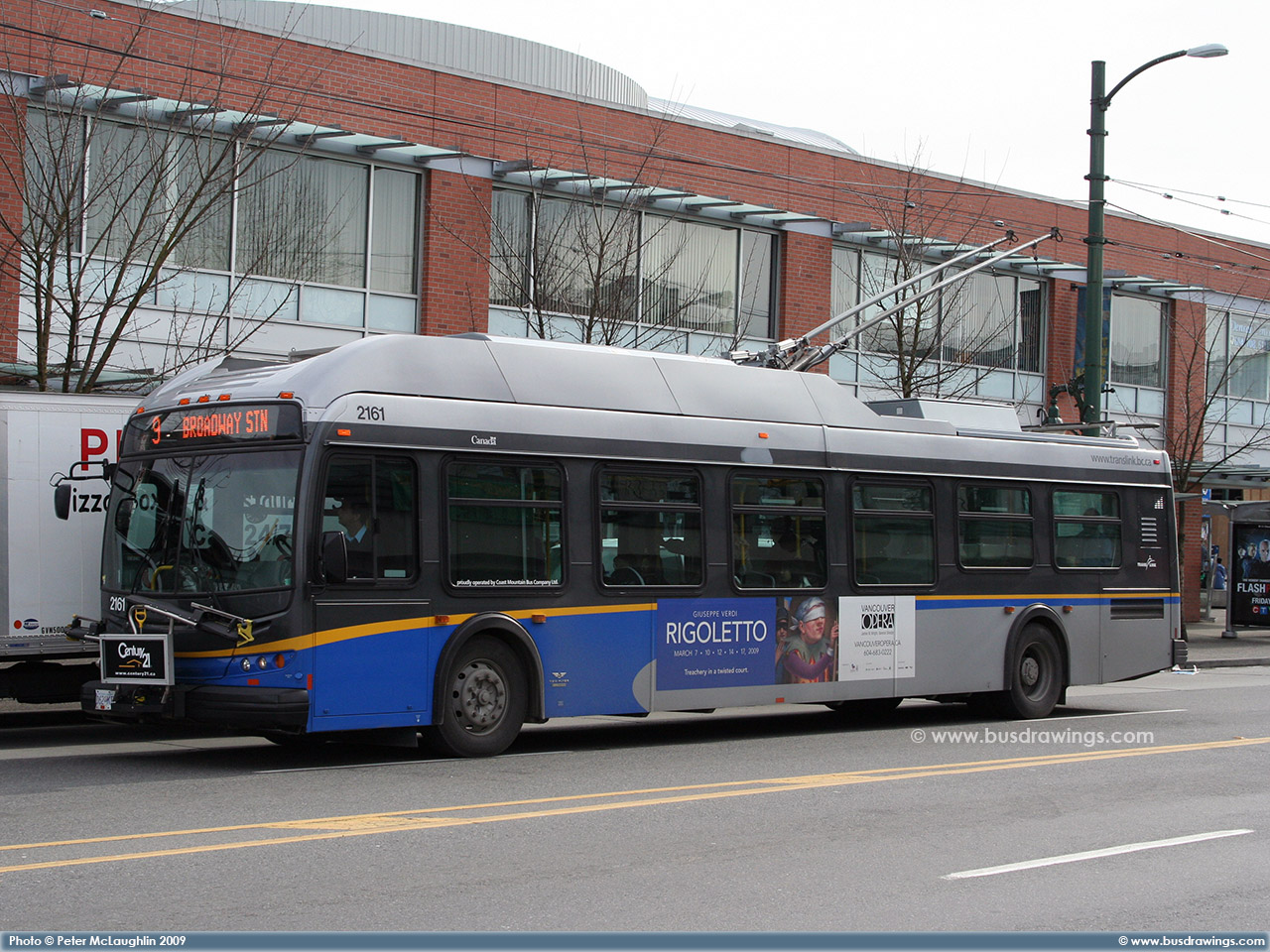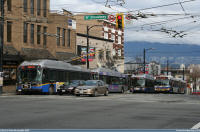 #2161 is seen on Commercial Drive just north of Broadway at the Broadway / Commercial Station on February 23, 2009. Photo captured by Peter McLaughlin. | |