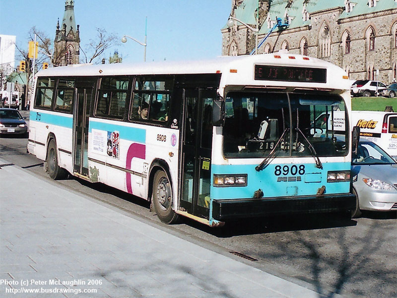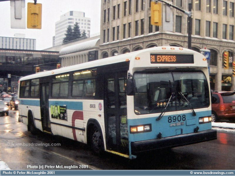 #8908 is seen working over in Ottawa Ontario during the afternoon rush heading out of the Downtown core to head back to Gatineau, Quebec hour of December 28, 2001. Photo by Peter McLaughlin. | |