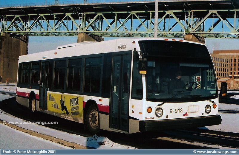 #9-913's Destination sign cannot even be read at all in this shot captured by Peter McLaughlin near the Longueuil Metro Station in December 2001. | |