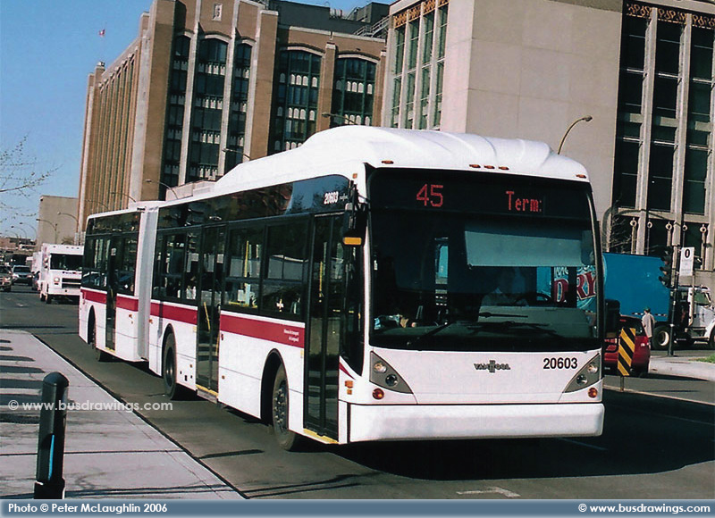 #20603 is seen in Downtown Montreal while working as a route 45 during the morning rush hour in this shot captured on April 21, 2006 by Peter McLaughlin. | |