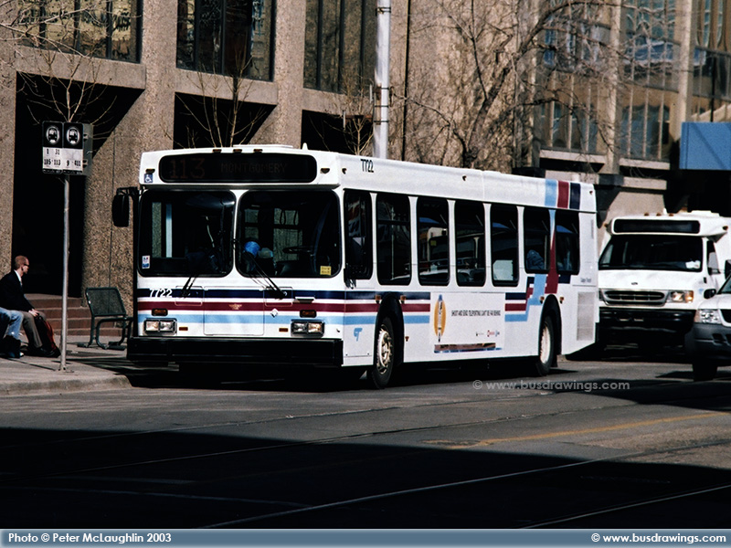 #7722 is seen taking a short break on 7th Ave in the Downtown Core while assigned to a route 113 Montgomery in this view taken by Peter McLaughlin on April 21, 2003. | |