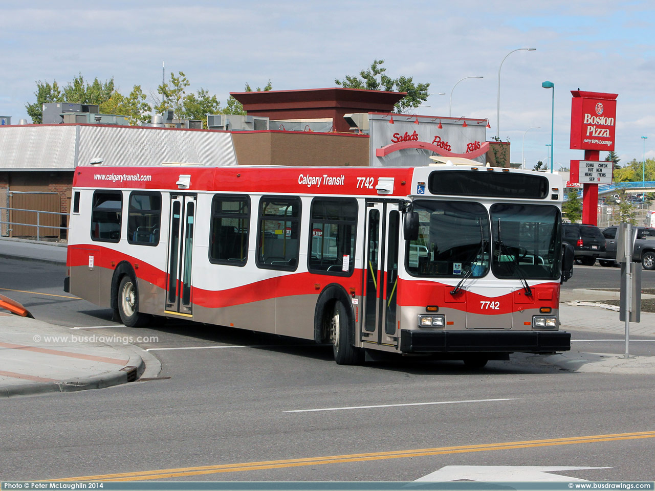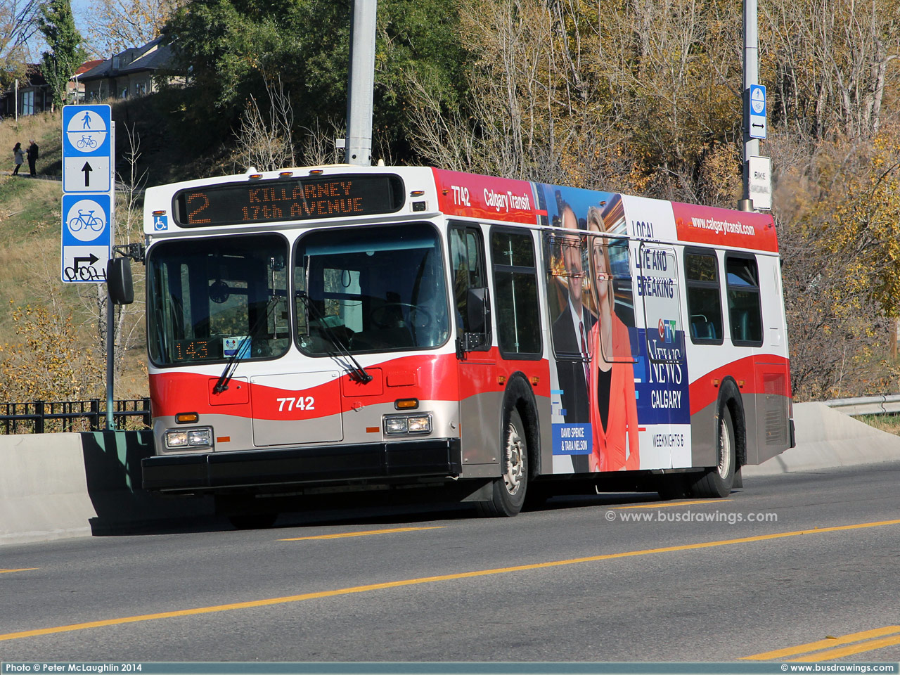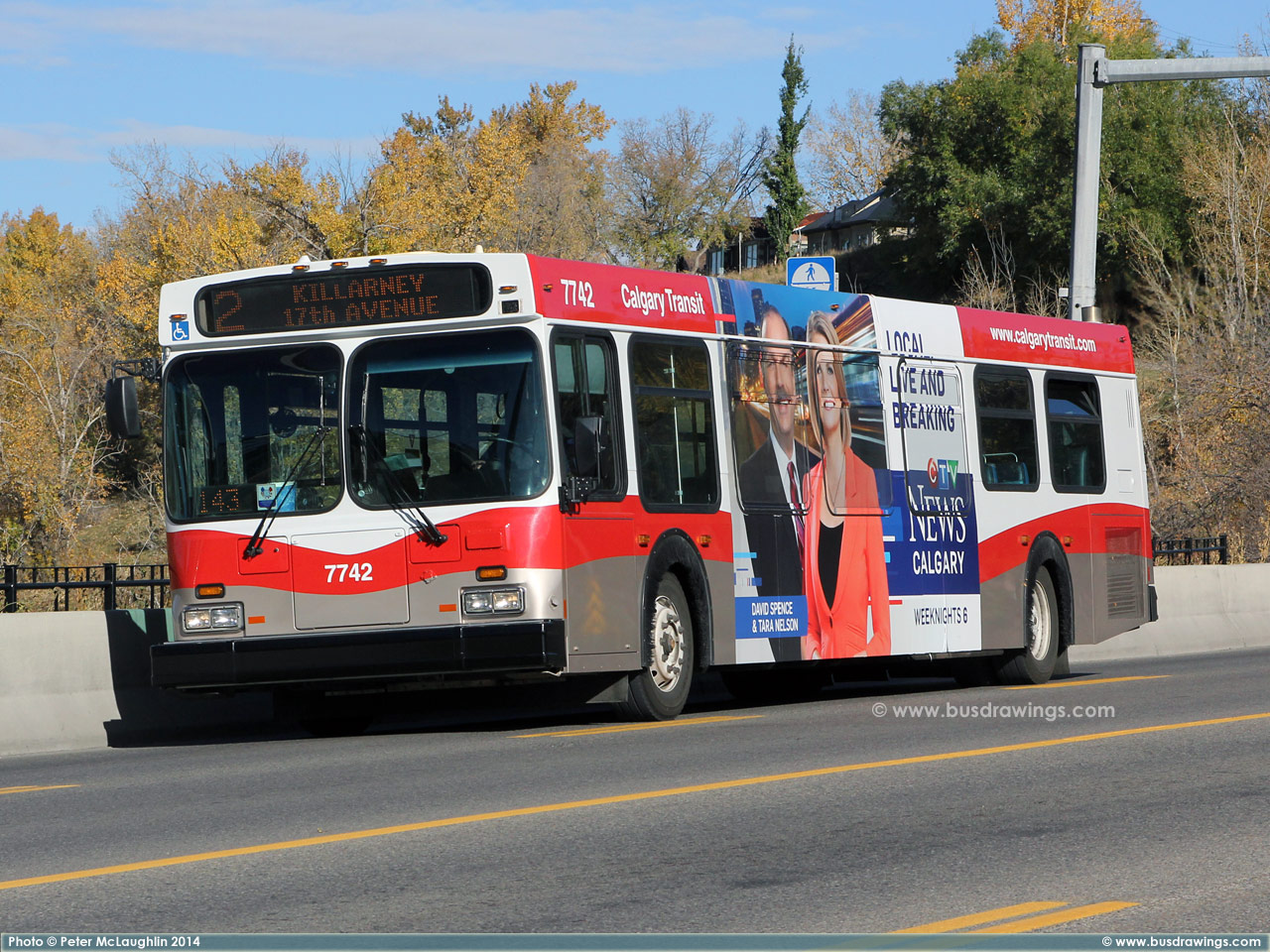 #7742 is seen southbound on Centre Street North at Samis Road while working a route 2 on October 12, 2014. Photos captured by Peter McLaughlin. | |