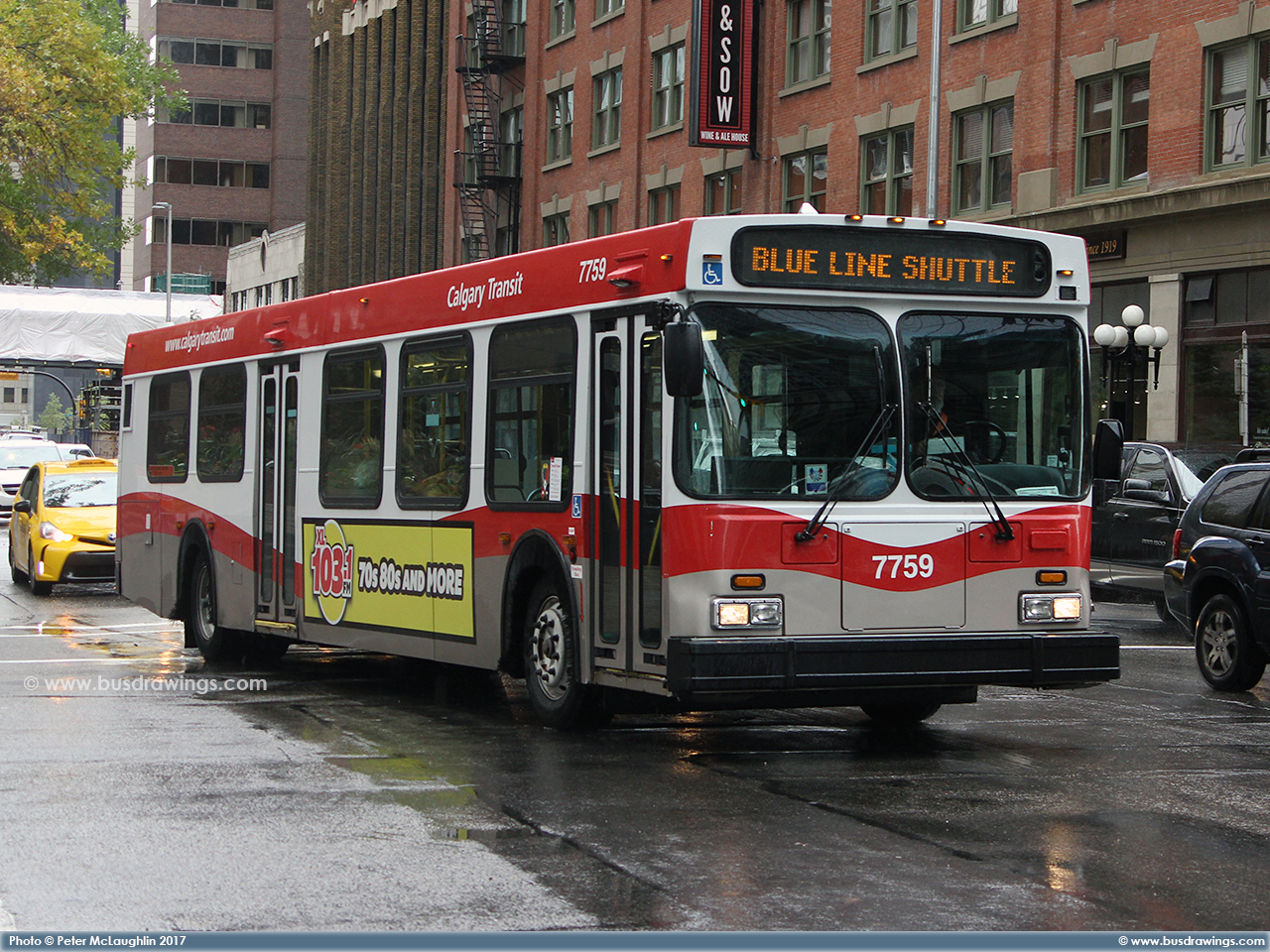 #7759 in the downtown core on 6th Ave. at 1st St. S.W. while working the Blue Line Shuttle on September 21, 2017. Photo captured by Peter McLaughlin. | |