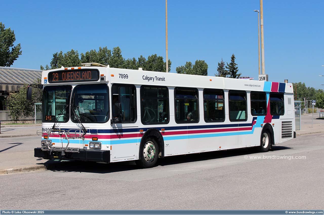 #7899 is seen on a layover at the Anderson Station before departing as a route 29 Queensland on July 31, 2025. Photo captured by Luke Olszewski. | |