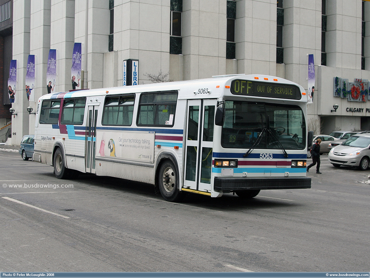 #5064 is seen in Downtown Calgary on 6th Ave at 1st St. S.W. working the route 63 Lakeview Express on June 27, 2003. Photo by Peter McLaughlin. | |