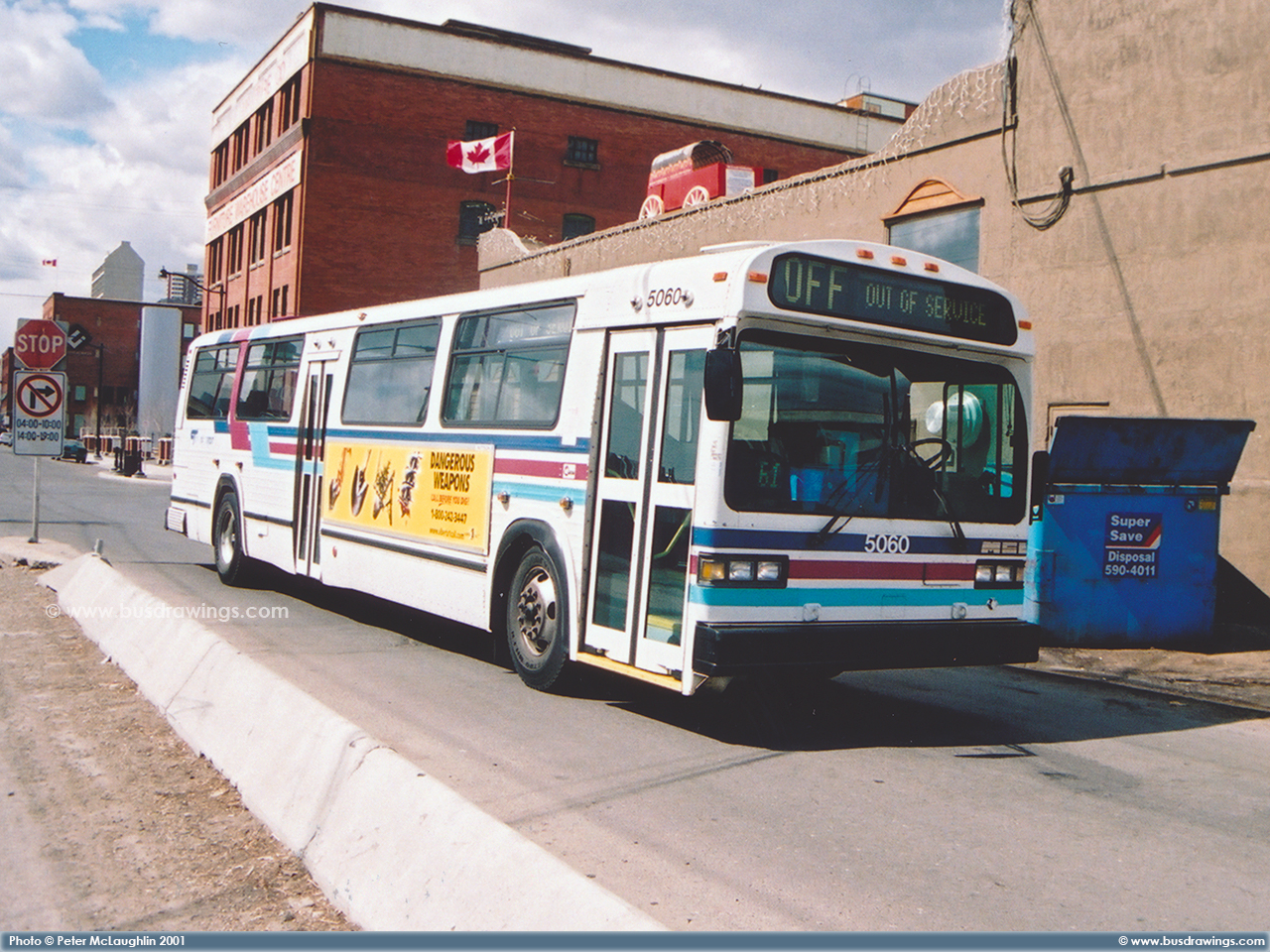 #5060 is seen eastbound on 11th Ave. at 4th Street S.E. heading towards the Victoria Park Garage on April 22, 2001. Photo captured by Peter McLaughlin. | |