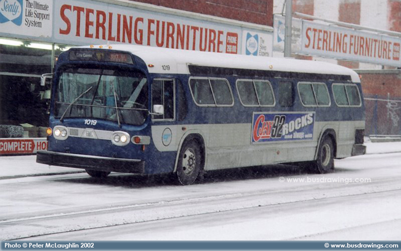 #1019 is seen operating in Downtown Calgary on a snowy day as a route 1 City Centre in this shot taken by Peter McLaughlin. This bus is slated for retirement sometime in the next few weeks as of May 23, 2004. This one and #1018 are the last Roll Sign buses left in service today in Calgary as of May 23, 2004. These buses were retired and removed from service not long after May of 2004. | |