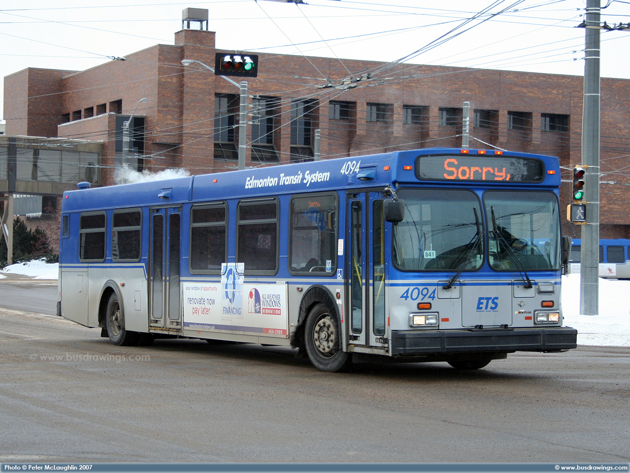 Here is #4046 waiting for passengers at the University of Alberta after arriving from the West Edmonton Mall as a route 4 on December 25, 2002 when I rode it. Photo by Peter McLaughlin. | |