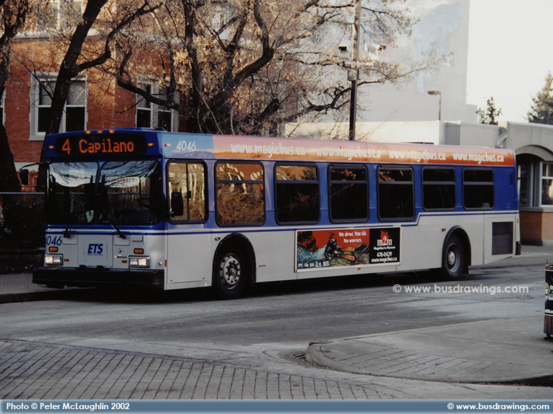 #4046 is seen taking a break at the West Edmonton Mall on Christmas Day, December 25, 2002 while assigned to a route 4 Capilano. I then hopped on board and took a ride to the University of Alberta on this bus. See the next shot. Photo Captured by Peter McLaughlin. | |