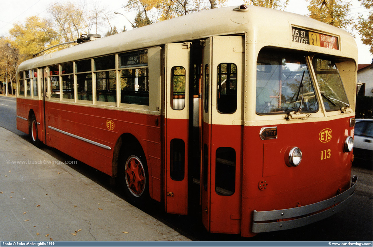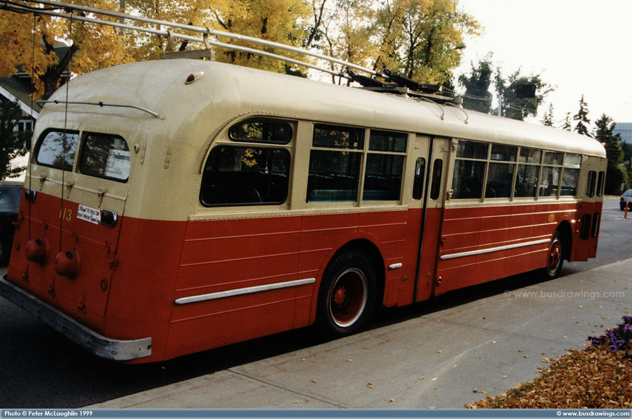 #113 (Ex-116) is seen on display on 102nd Ave. at the Provincial Museum of Alberta for the 60th Aniversary of Trolley Buses in Edmonton. Photos captured by Peter McLaughlin on September 25, 1999. | |