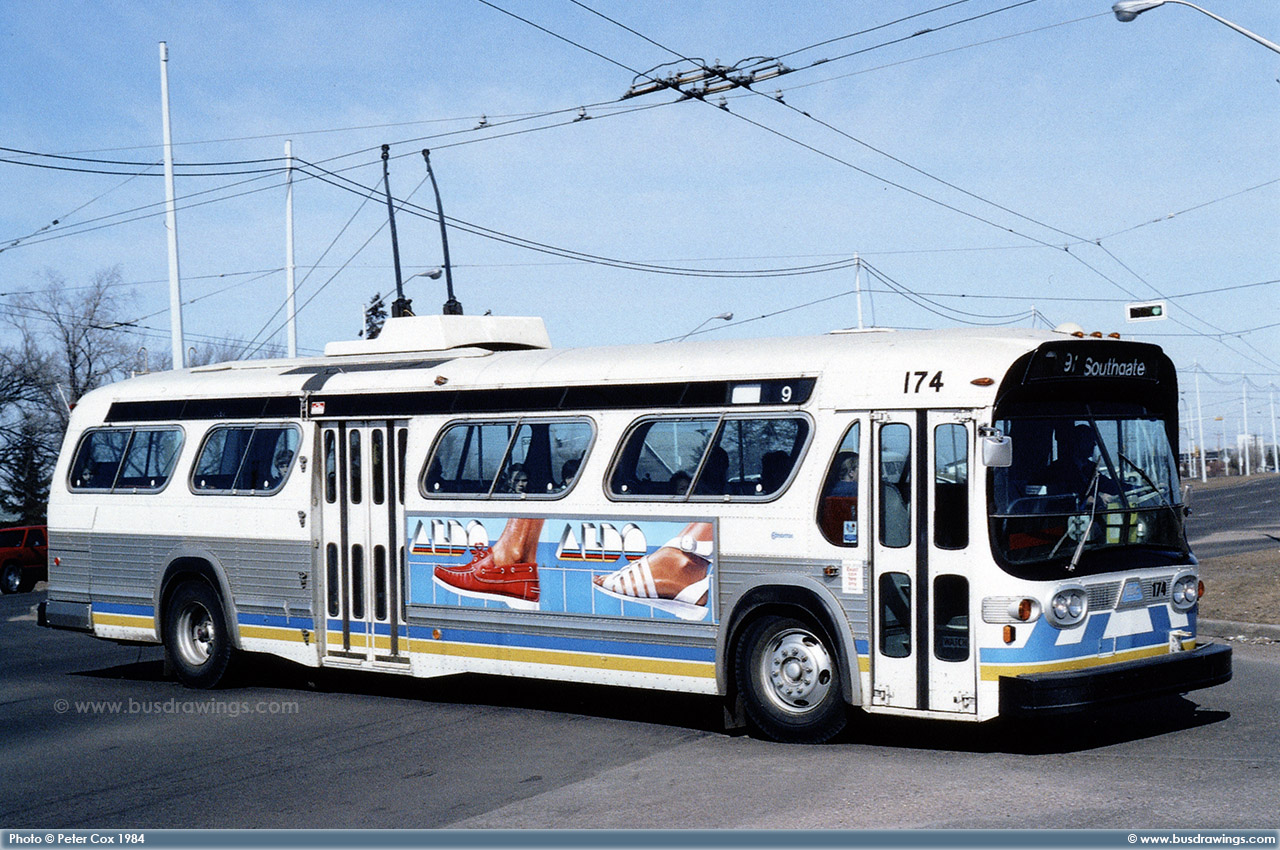 #174 is seen arriving at the Southgate Transit Centre on April 2, 1984. Photo captured by Peter Cox. | |