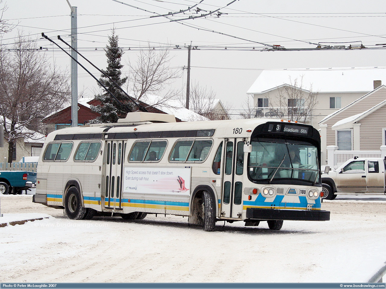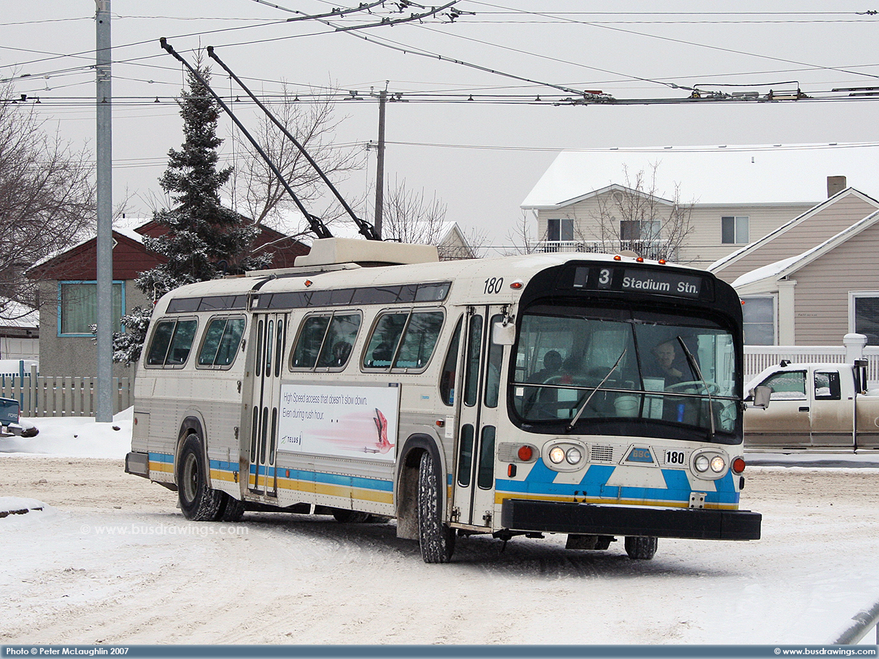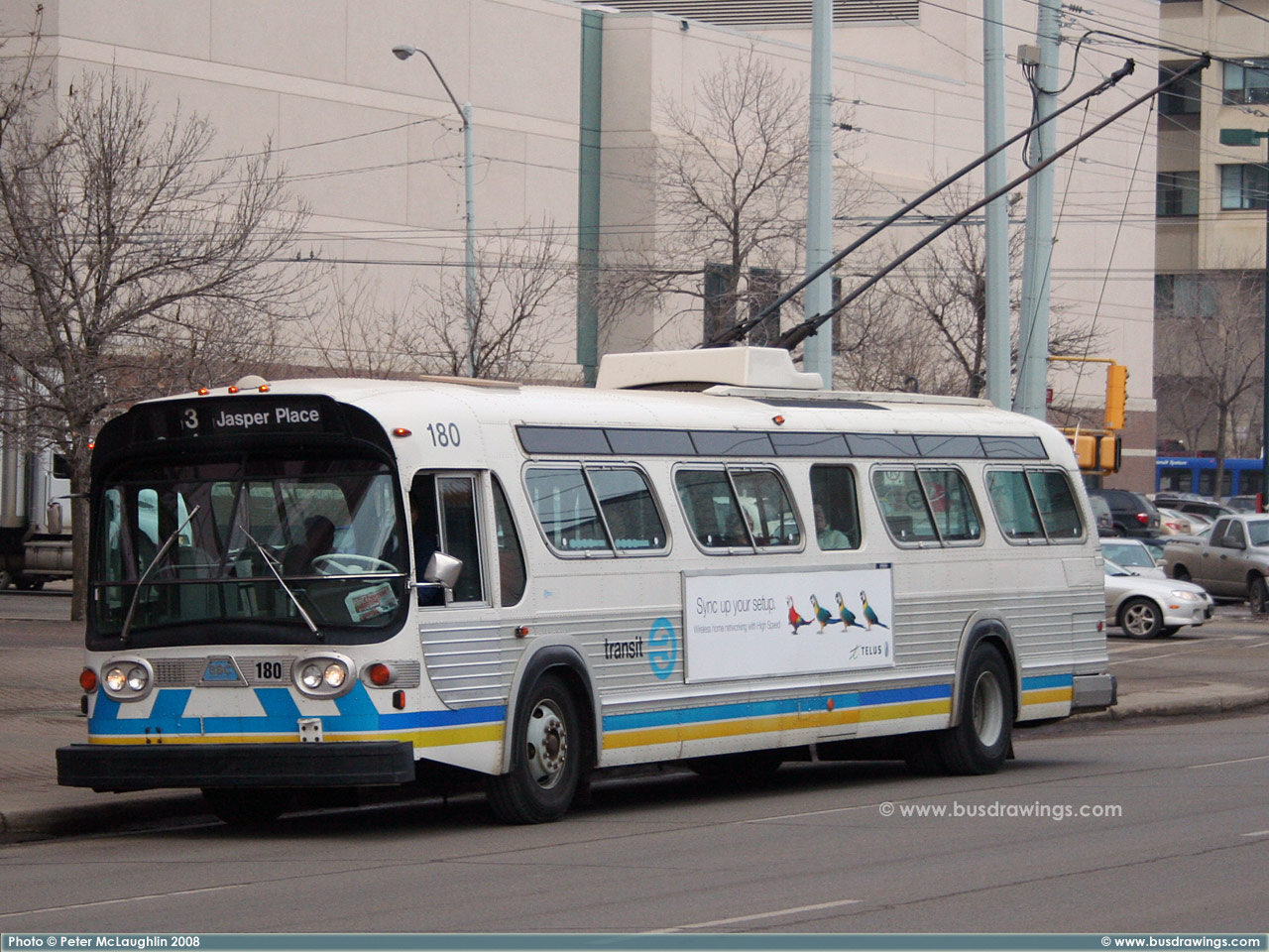 #180 is seen arriving at the Jasper Place Transit Centre on February 5, 2007. Photos captured by Peter McLaughlin. | |