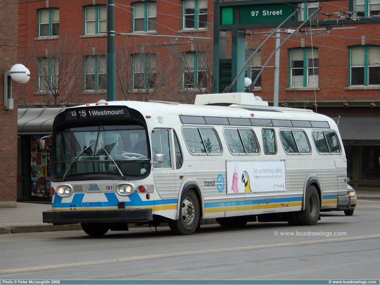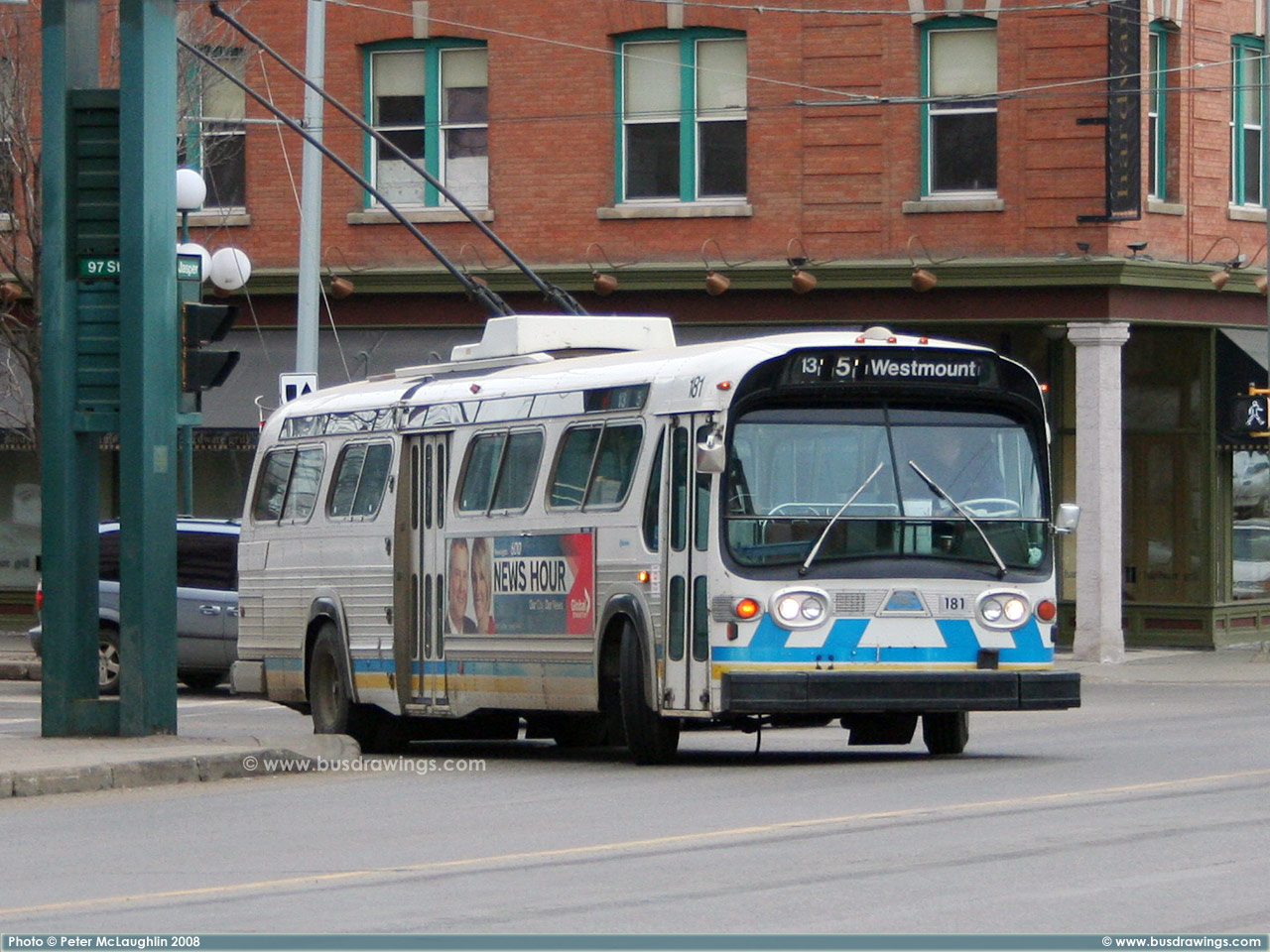 #181 is seen working on Jasper Ave. near 110th St. as a route 135 Downtown in this shot captured by Peter McLaughlin in July 2005. | |