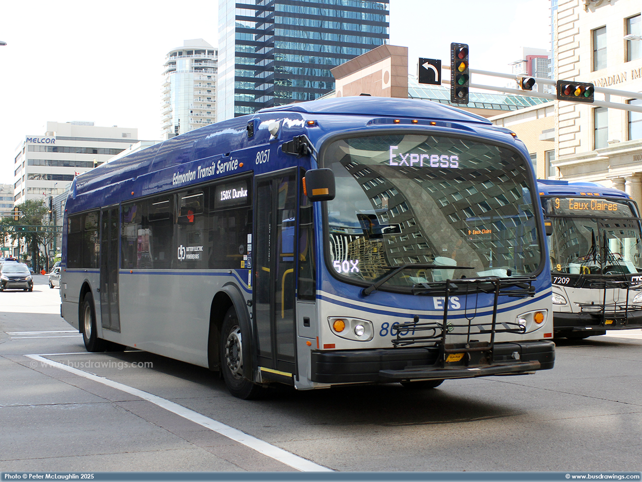 #8051 is seen in the downtown core eastbound on Jasper Ave. at 101st St. while working a trip on the route 150X on July 25, 2025. Photo captured by Peter McLaughlin. | |
