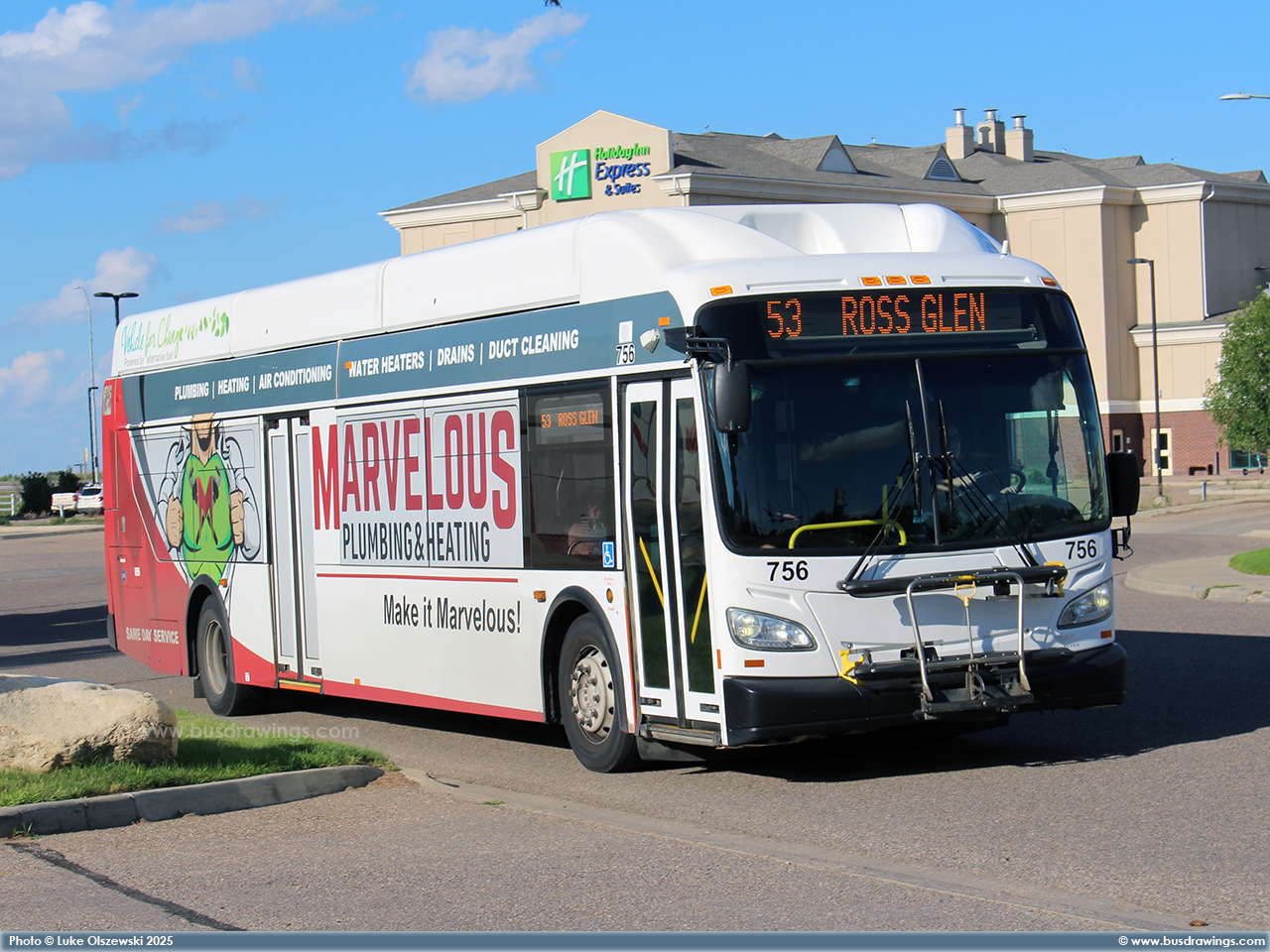 #756 is seen on Strachan Road by the Holiday Inn while working the route 53 on July 30, 2025. Photo captured by Luke Olszewski. | |