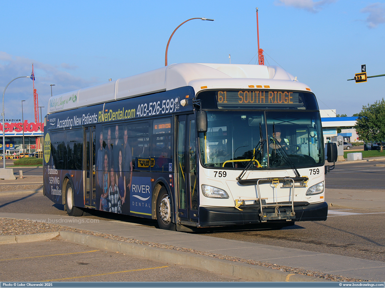 #759 is seen by the Medicine Hat Mall bus Terminal while working the route 61 on July 30, 2025. Photos captured by Luke Olszewski. | |