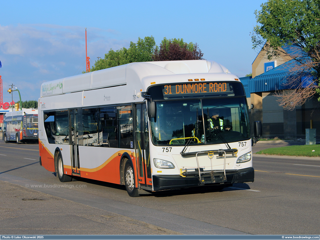 #757 is seen by the Medicine Hat Mall bus Terminal while working the route 31 on July 30, 2025. Photo captured by Luke Olszewski. | |