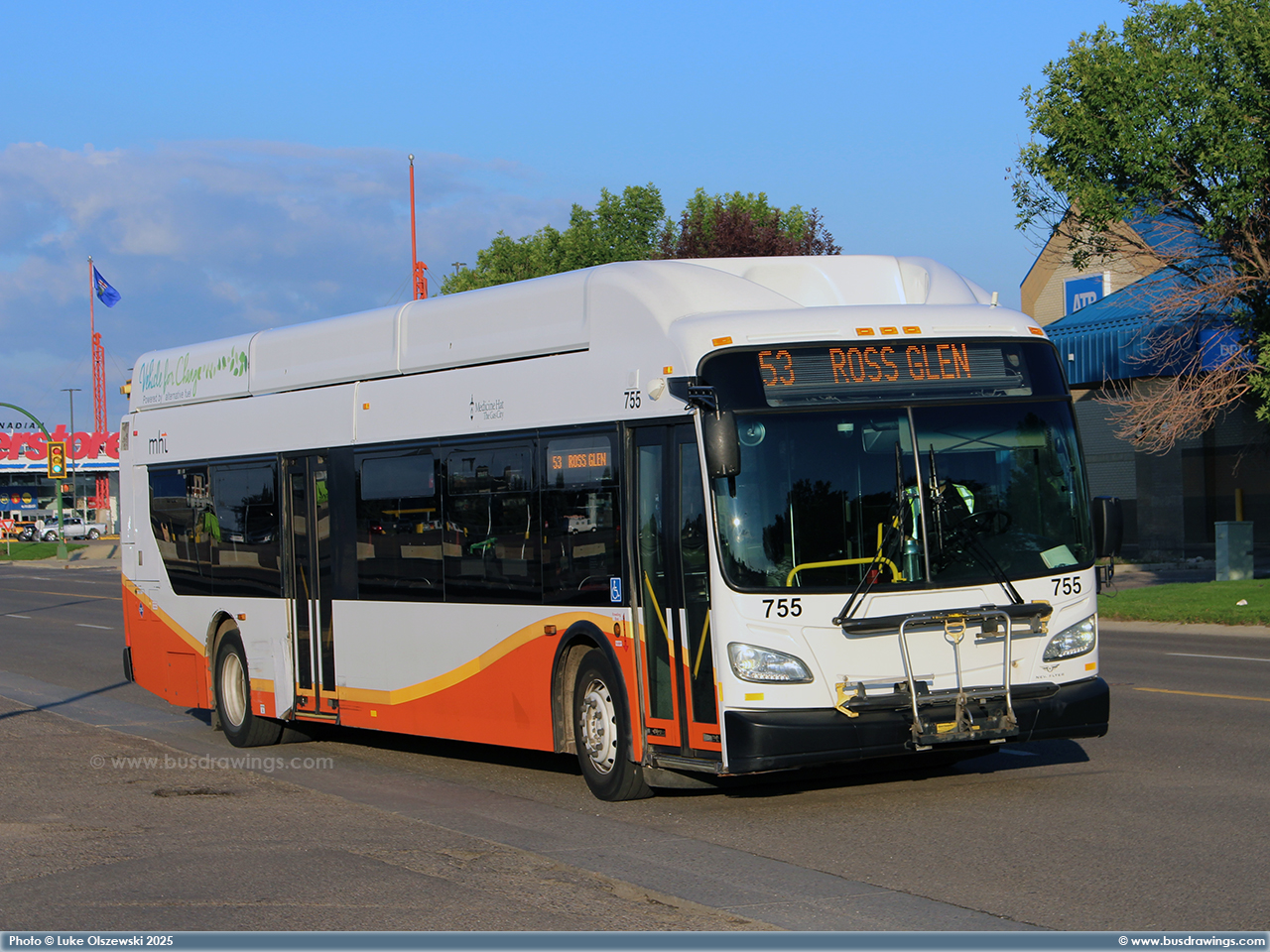 #755 is seen by the Medicine Hat Mall bus Terminal while working the route 53 on July 30, 2025. Photo captured by Luke Olszewski. | |
