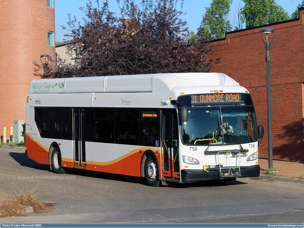 #758 is seen leaving the downtown Bus Terminal while working a route 31 on July 30, 2025. Photo captured by Luke Olszewski. | |
