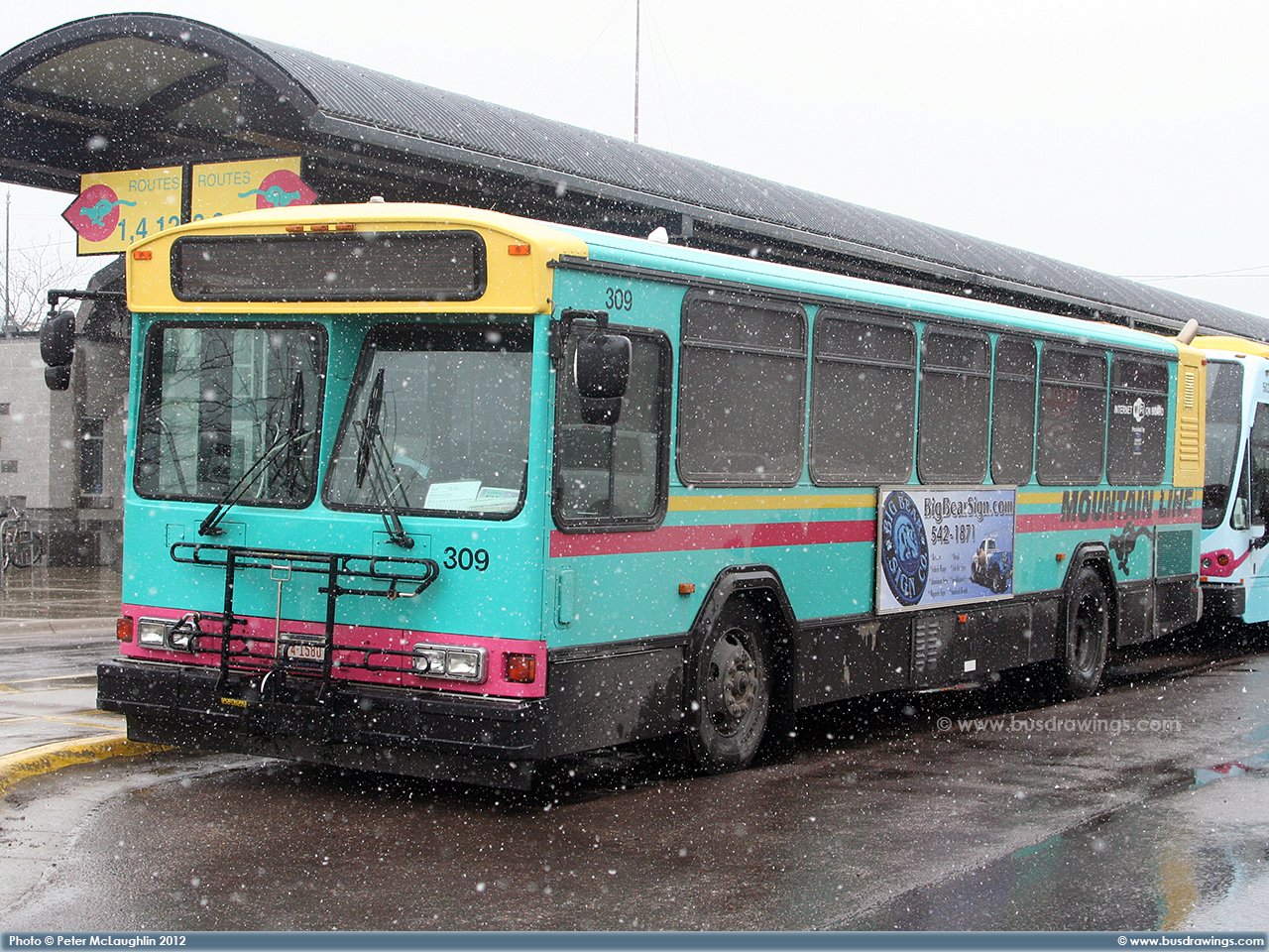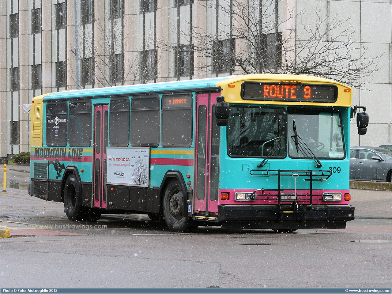 #309 departing from the downtown Transit Terminal on April 6, 2012. Photo captured by Peter McLaughlin. | |