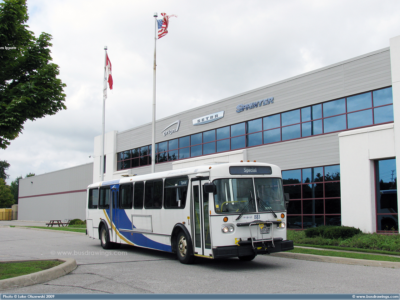 #883 is seen at the Orion Plant in Mississauga posed for photos during the "Oakville Transit Orion I #883 Farewell Charter" which was organized by Felix Tse and Jan Boic. Photos captured by Luke Olszewski on August 29, 2009. | |