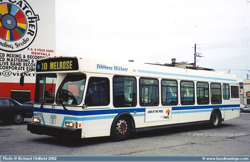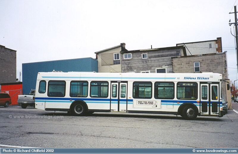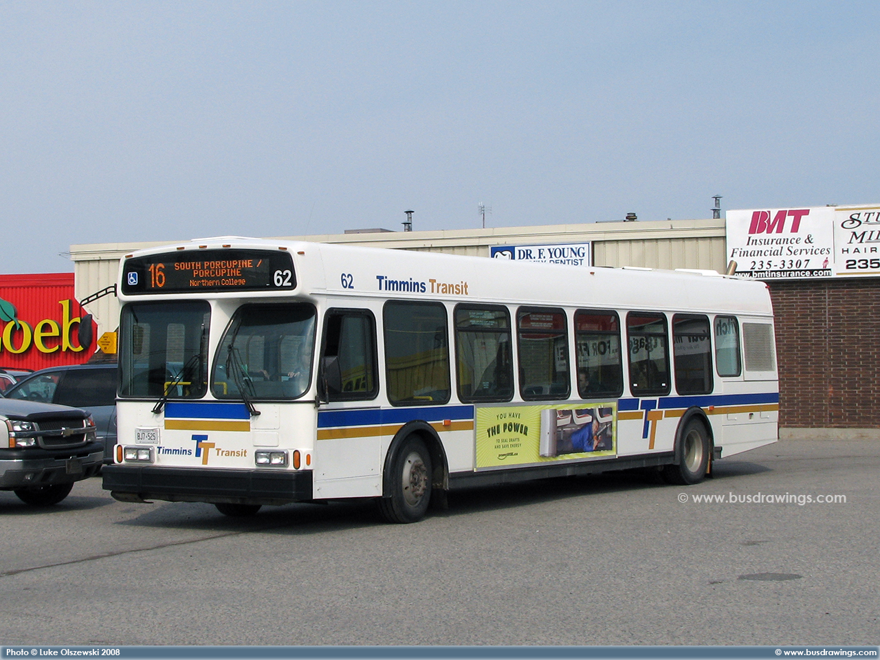 #62 is seen operating in Downtown Timmins on an unidentified route in this view captured by Richard Oldfield on October 10, 2002. | |