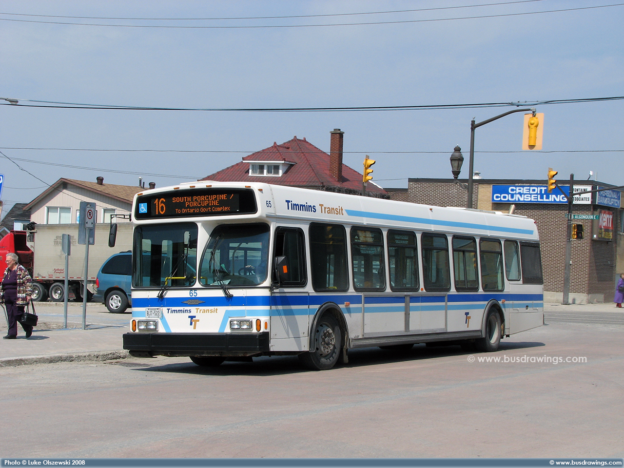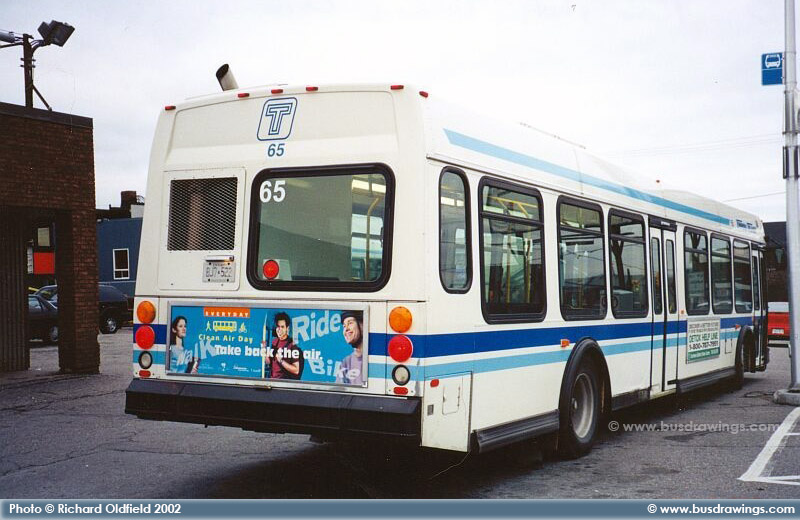 Here is a rear shot of #65 while she seems to be on a layover at a Transit Terminal in Downtown Timmins in this view captured by Richard Oldfield on October 10, 2002. | |