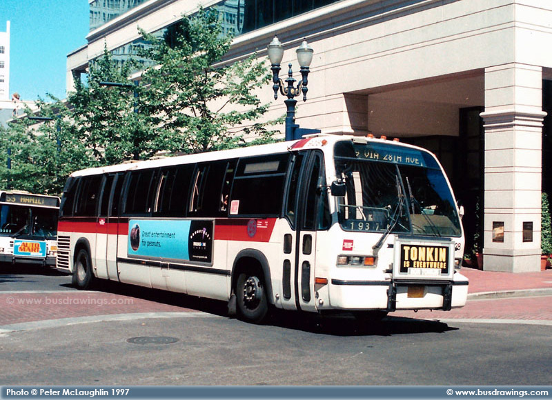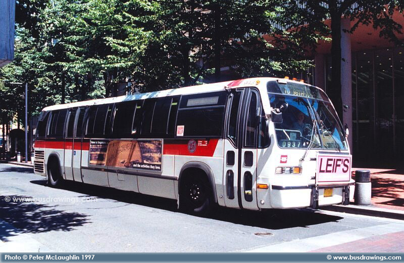 #943 is seen operating as a route 9 in Downtown Portland in this shot captured by Peter McLaughlin in July 1997. | |