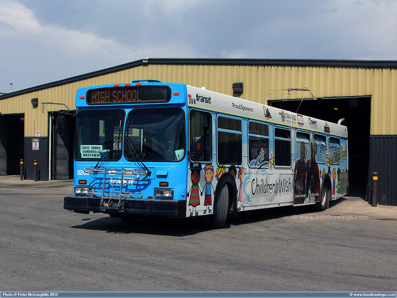 #0206 is seen leaving the old Saskatoon Transit Garage in the afternoon on May 26, 2015. Photo captured by Peter McLaughlin. | |
