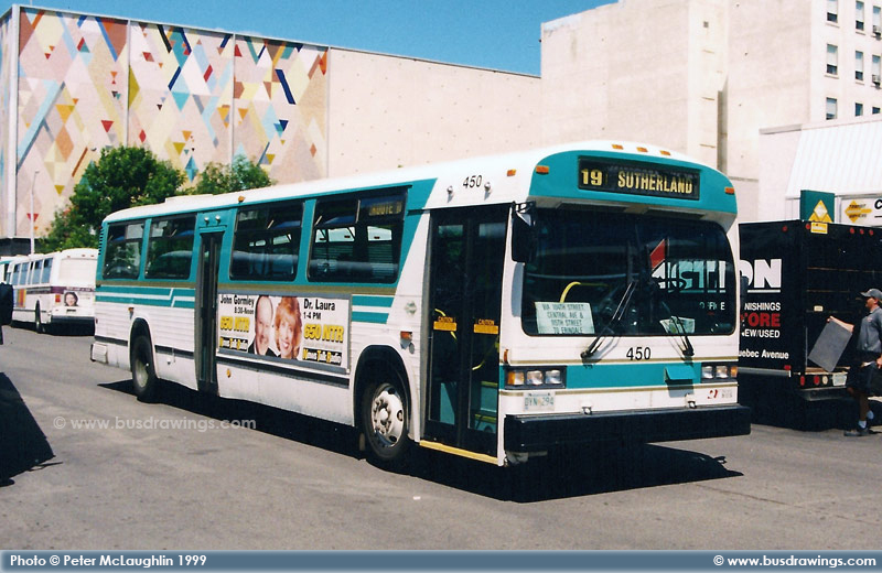 #450 is seen operating in the Downtown Core as a route 19 Sutherland in this shot captured by Peter McLaughlin on June 17, 1999. | |