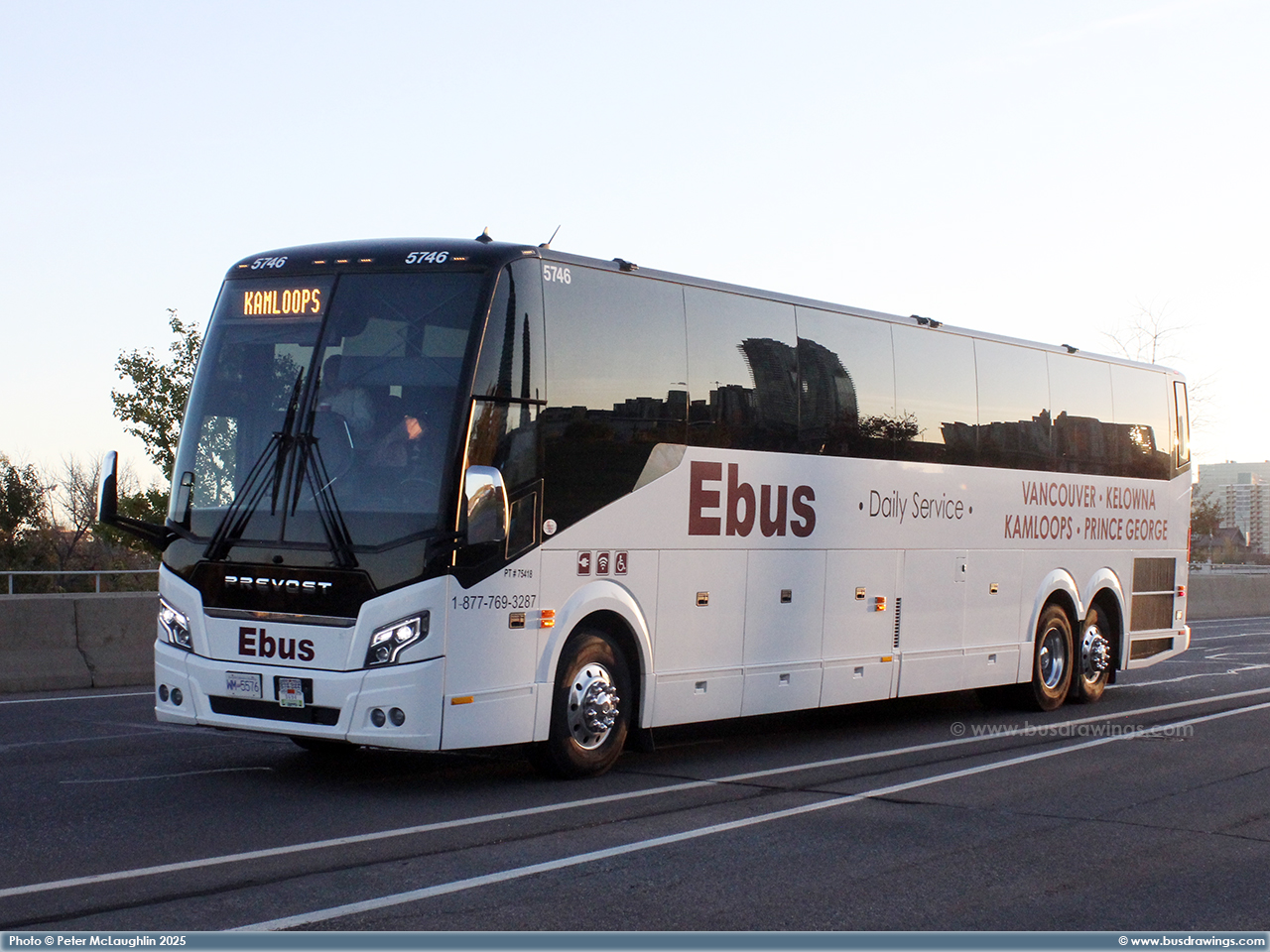 #5746 is seen at the downtown Calgary, Alberta Red Arrow / Ebus stop on 5th Street at 5th Ave. S.W. preparing to depart for Kamloops via Salmon Arm on October 11, 2025. Photo captured by Peter McLaughlin. | |
