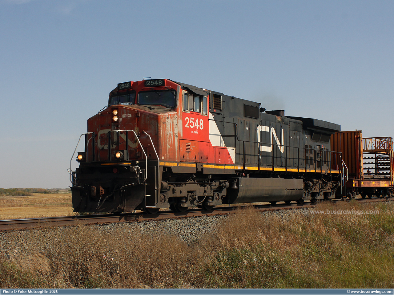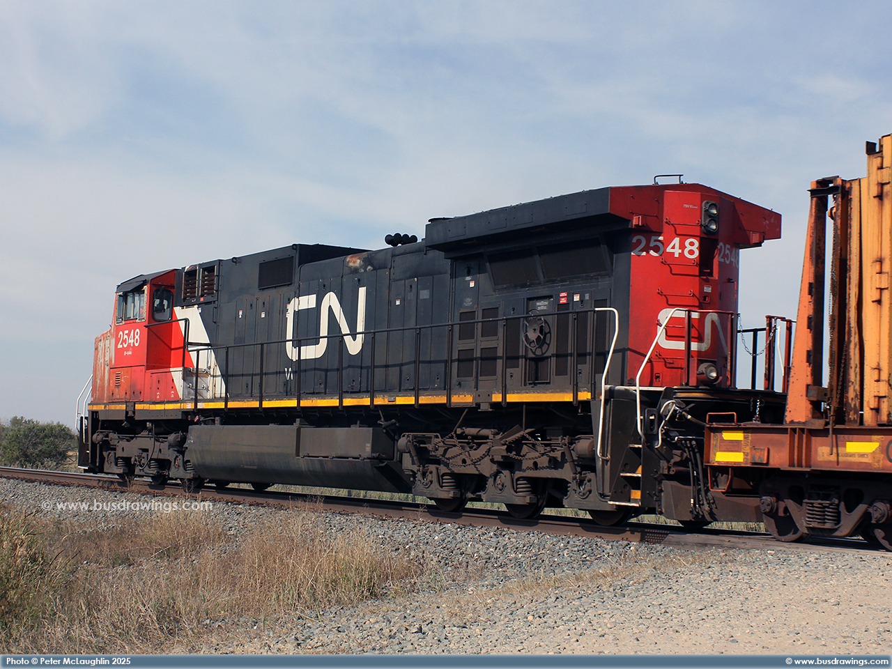 #2548 is seen heading Westbound on the CN Wainwright Subdivision west of the Town of Viking, Alberta while hauling a Continuous Welded Rail Train on September 20, 2025. Photos captured by Peter McLaughlin. |