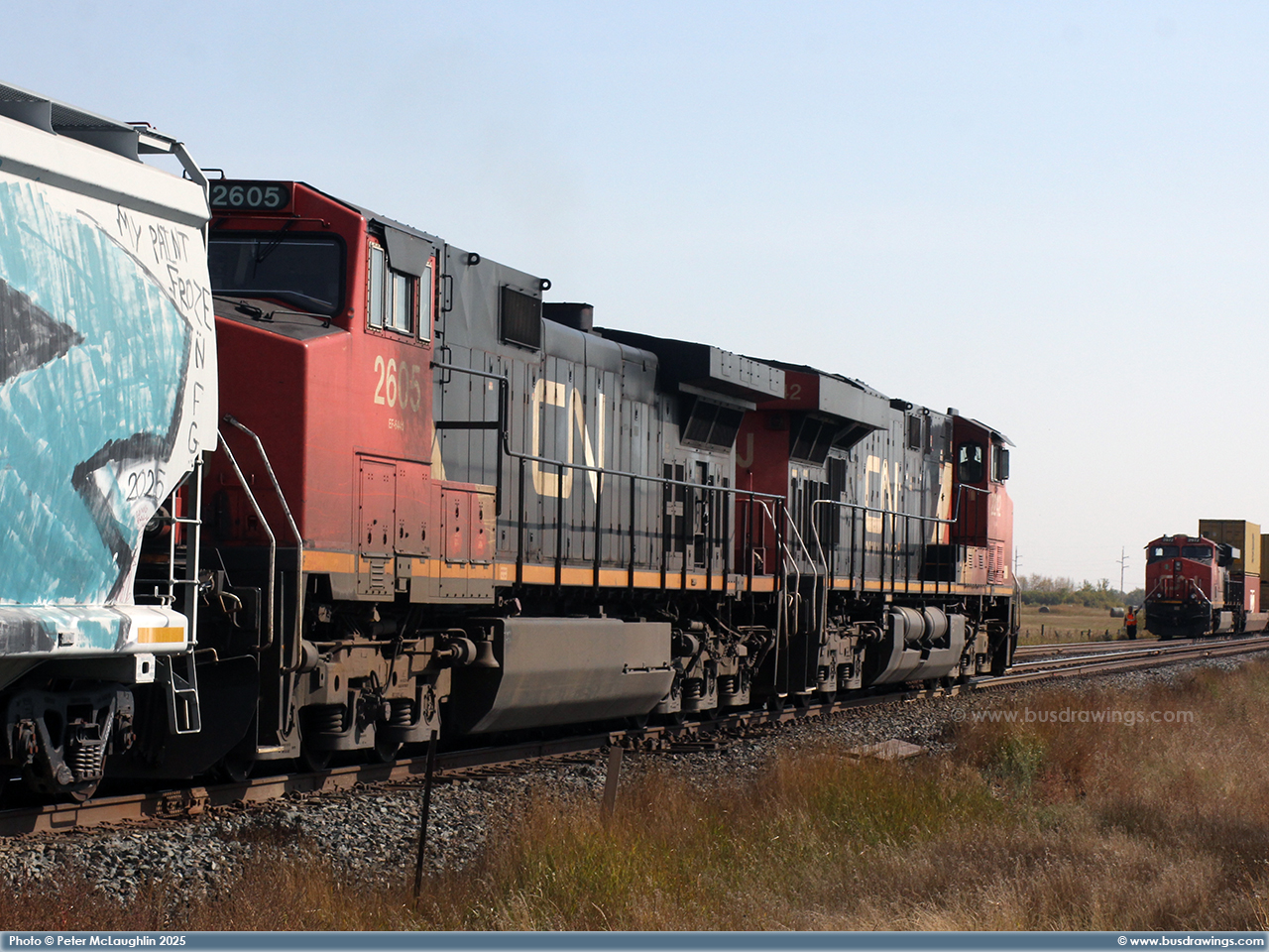 #2605 is seen working with ES44DC #2242 leading mixed manifest freight train ID #316 on the CN Wainwright Subdivision near the Hamlet of Bruce, Alberta on September 20, 2025. Photos captured by Peter McLaughlin. |
