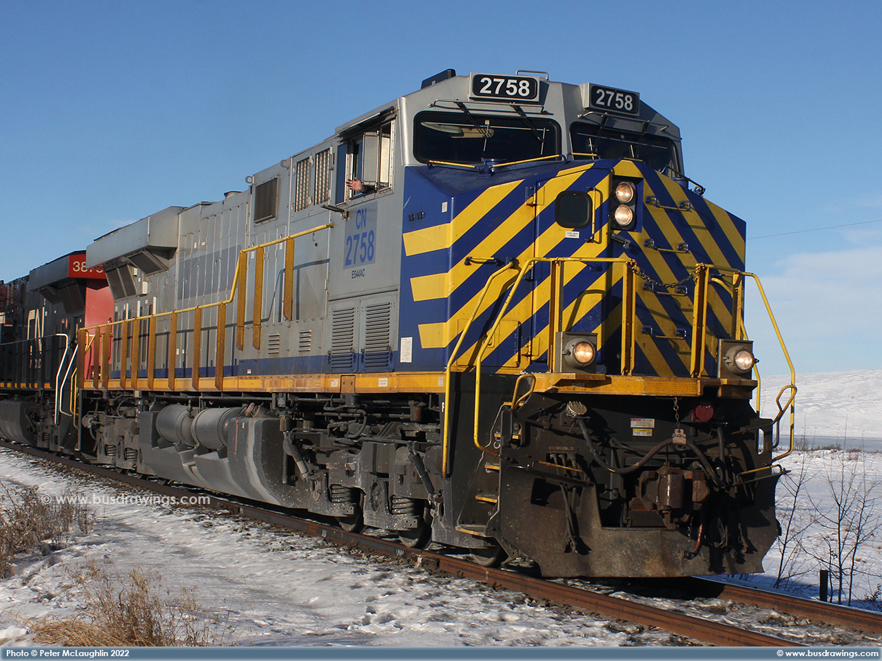 #2758 is seen leading Train 442 Southbound on the Three Hills Subdivison at Mile 50 in Trochu, Alberta on November 19, 2022. Photo captured by Peter McLaughlin. |