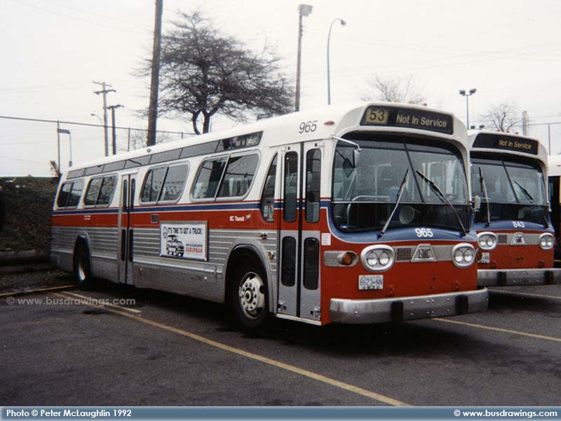 #965 is seen parked at the Victoria Transit Garage waiting for it's next run assignment in this shot taken in January 1992 by Peter McLaughlin. Beside #965, you can see 1981 T6H-5307N #843 which now currently operates for the Strathcona County Transit in Sherwood Park, Alberta as #912 which was purchased from Victoria in December 1999. | |
