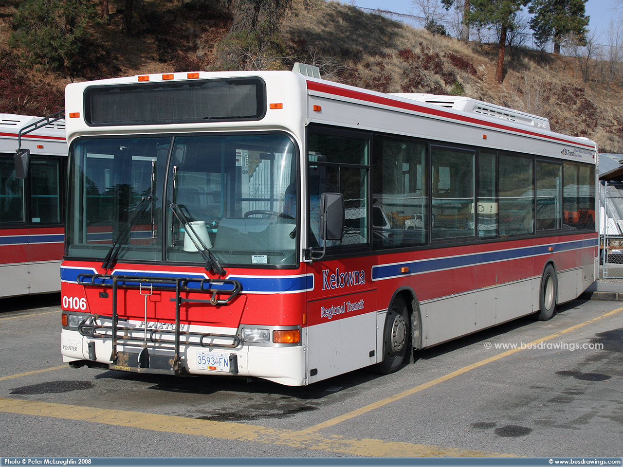 #0106 resting at the Kelowna Transit Garage on November 17, 2008. Photo captured by Peter McLaughlin. | |