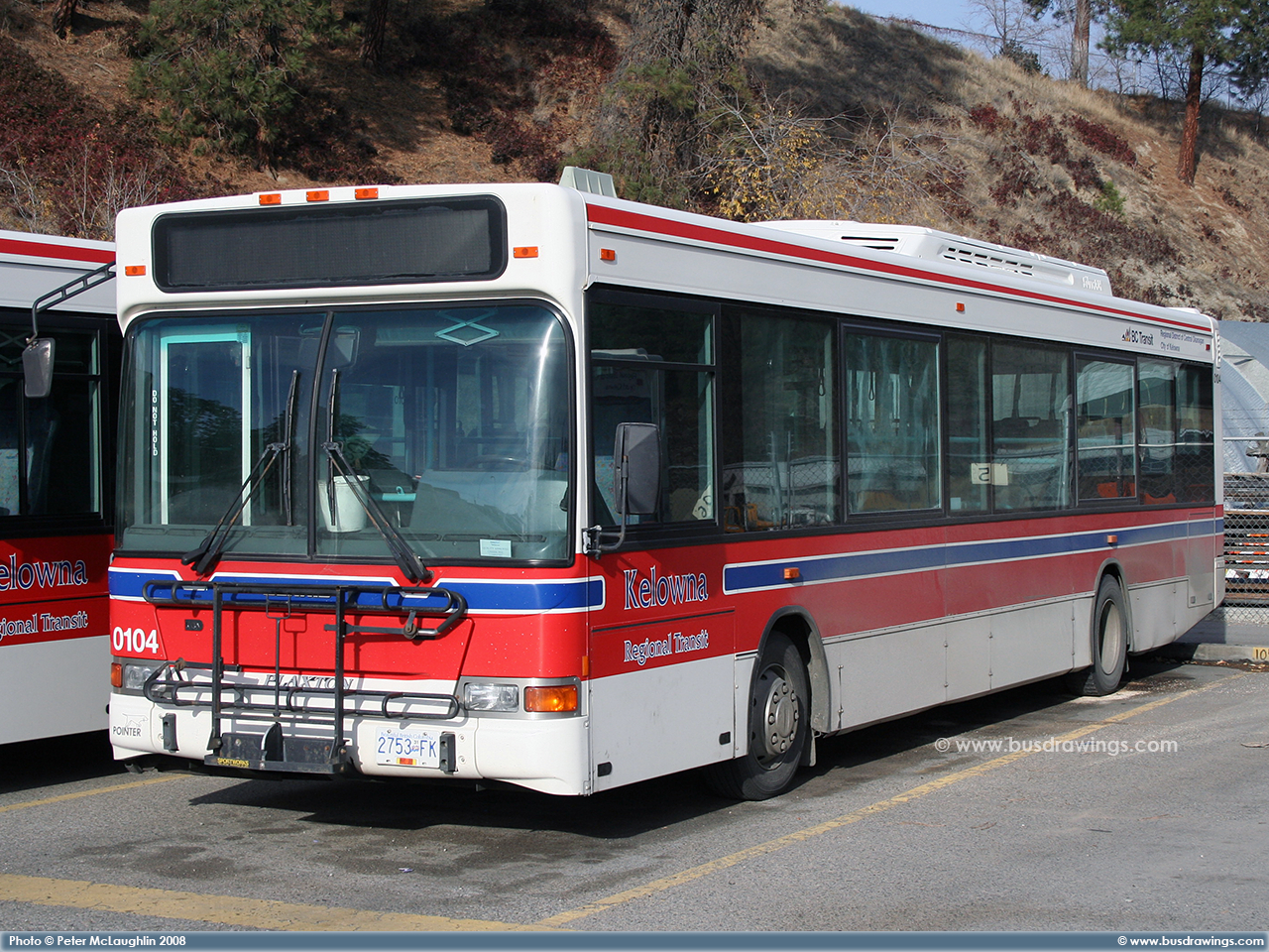 #0104 resting at the Kelowna Transit Garage on November 17, 2008. Photo captured by Peter McLaughlin. | |
