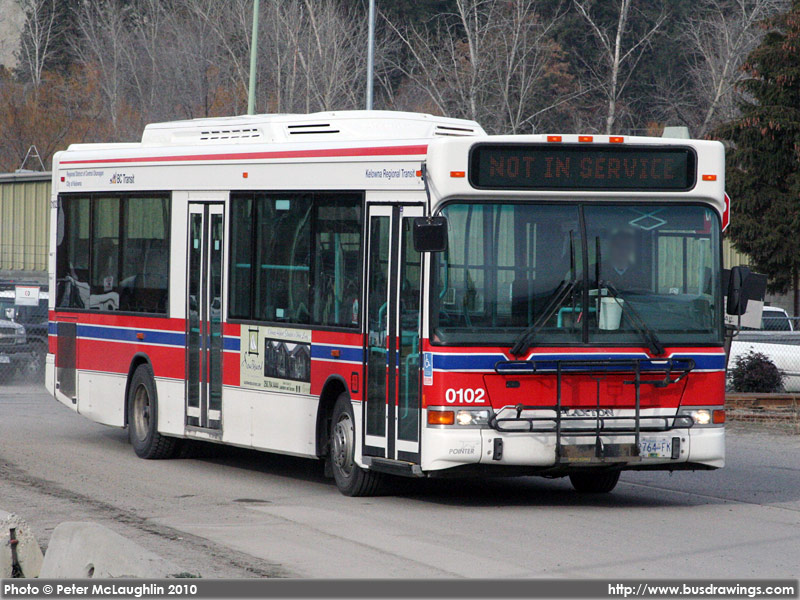 #0102 has just departed the Kelowna Transit Garage for the afternoon peak hours. Photo captured by Peter McLaughlin on February 23, 2010. | |