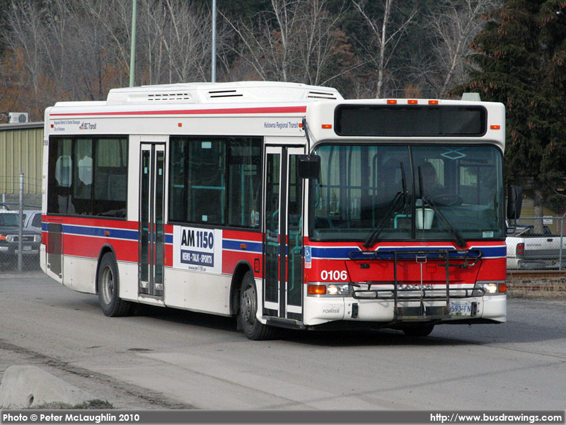 #0106 has just departed the Kelowna Transit Garage for the afternoon peak hours. Photo captured by Peter McLaughlin on February 23, 2010. | |