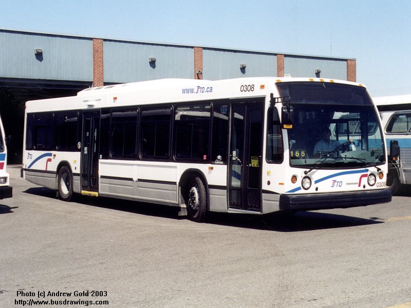 #0308 is shown on display at the STO Transit Garage showing off the latest STO Livery. Photo taken by Andrew Gold in June 2003. | |