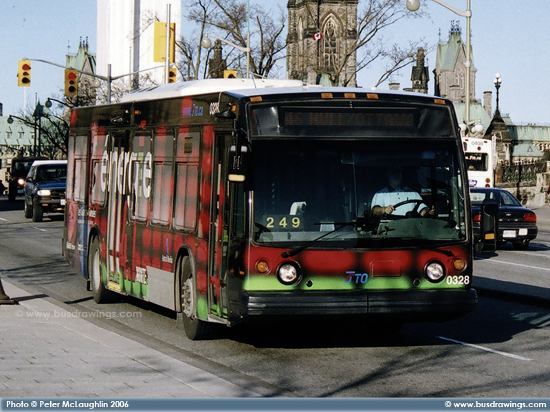 #0328 is seen sporting an all over ad wrap as she heads through Downtown Ottawa as a route 46 in this shot captured by Peter McLaughlin on April 19, 2006. | |