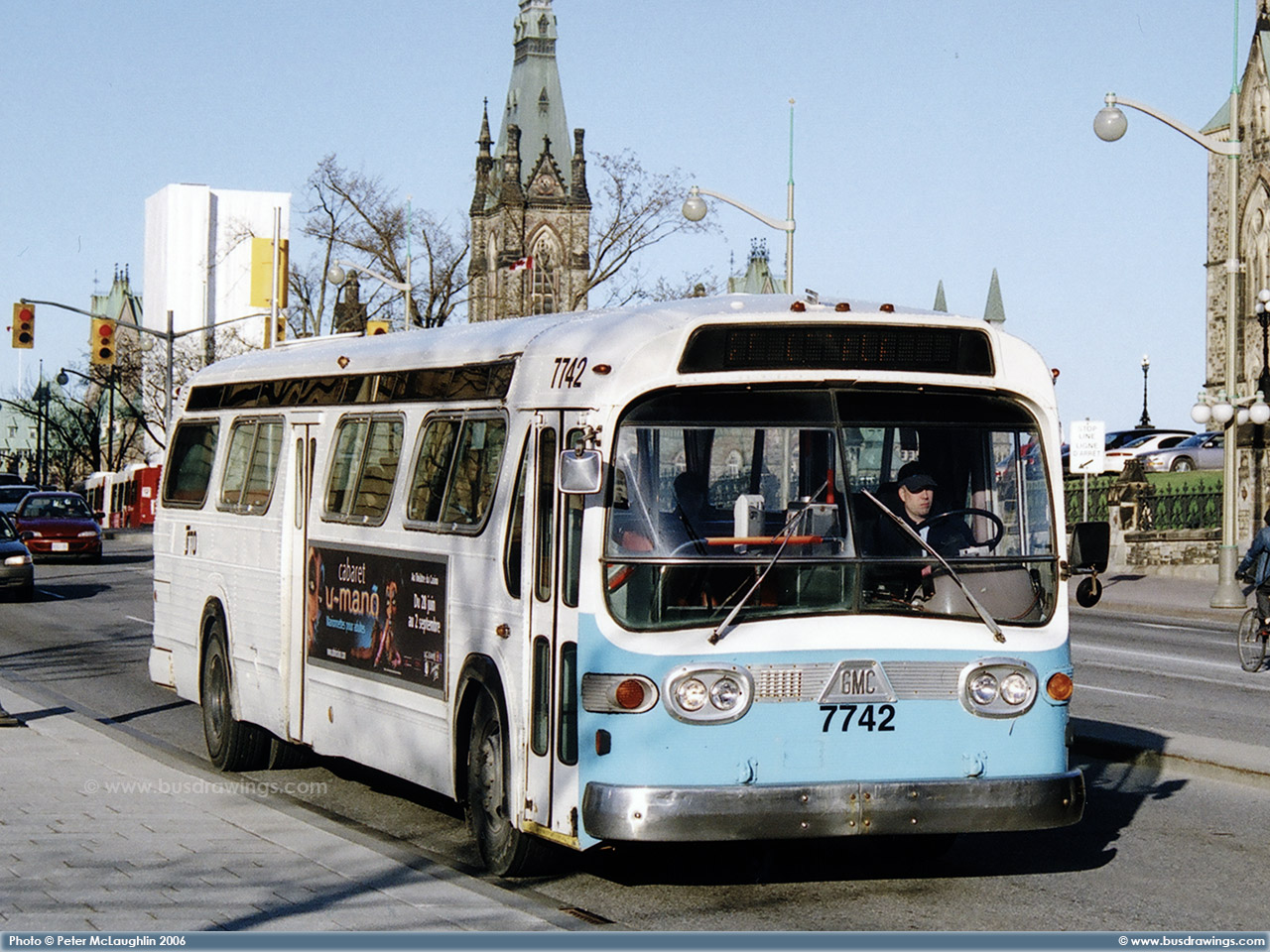 #7742 is seen heading down Rideau St. in Downtown Ottawa while working on an unidentified route in this shot captured by Peter McLaughlin in April 2006. | |
