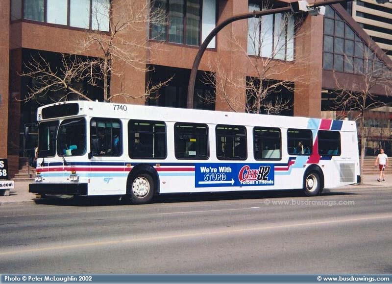 #7740 is seen loading/unloading passengers on Centre St. and 6th Ave. S. on an unidentified route in this view captured by Peter McLaughlin in May 2002. | |