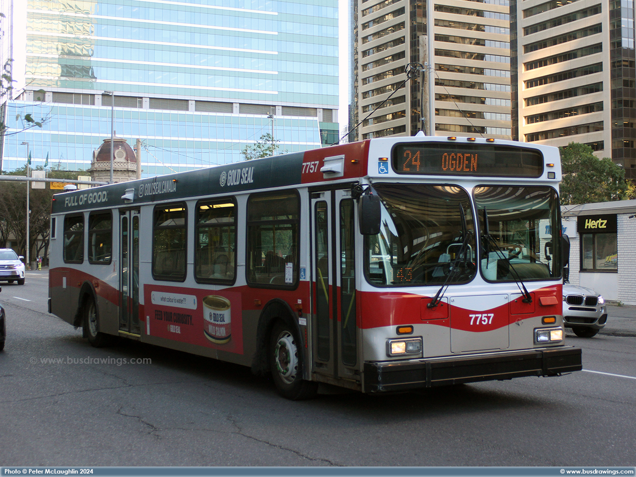 #7757 is seen working a route 24 on 6th Ave. at 1st St. S.E. on September 5, 2024. At the time of these photos, #7757 was the last 2001 D40LF still in active service and would end up retired later that same month. Photos captured by Peter McLaughlin. | |