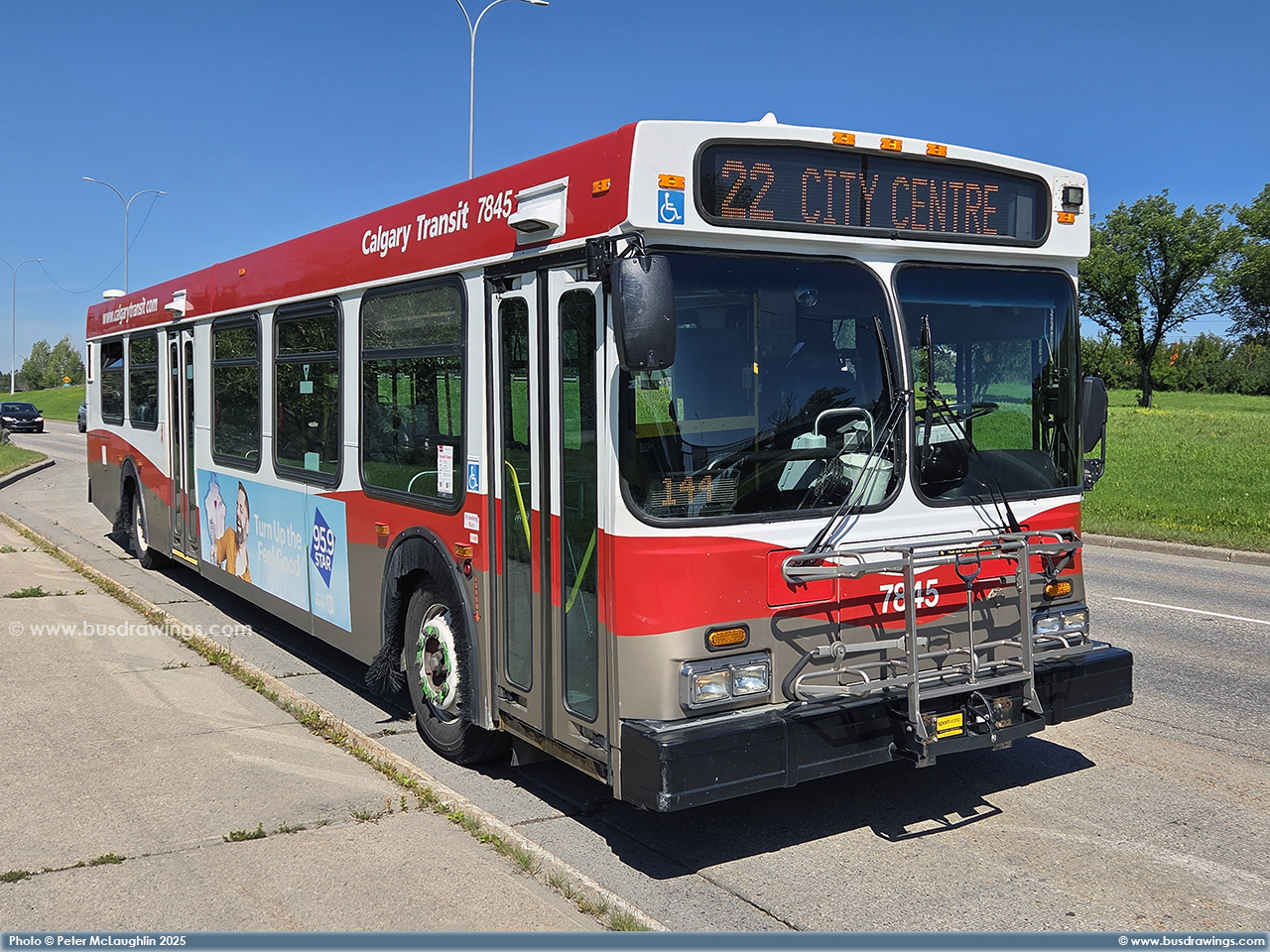 #7845 is seen eastbound on Richmond Road on the west side of Crowchild Trail S.W. while working a route 22 on July 31, 2025. Photo captured by Peter McLaughlin. | |