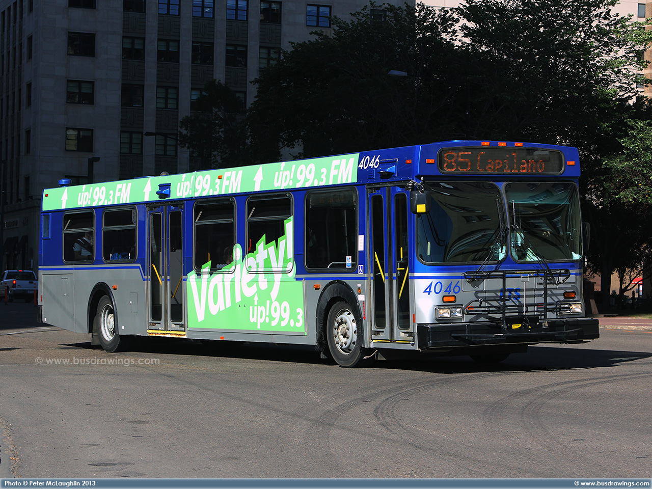 #4046 is seen southbound on 101 St. just south of Jasper Ave. while working a route 85 on September 11, 2013. Photo captured by Peter McLaughlin. | |