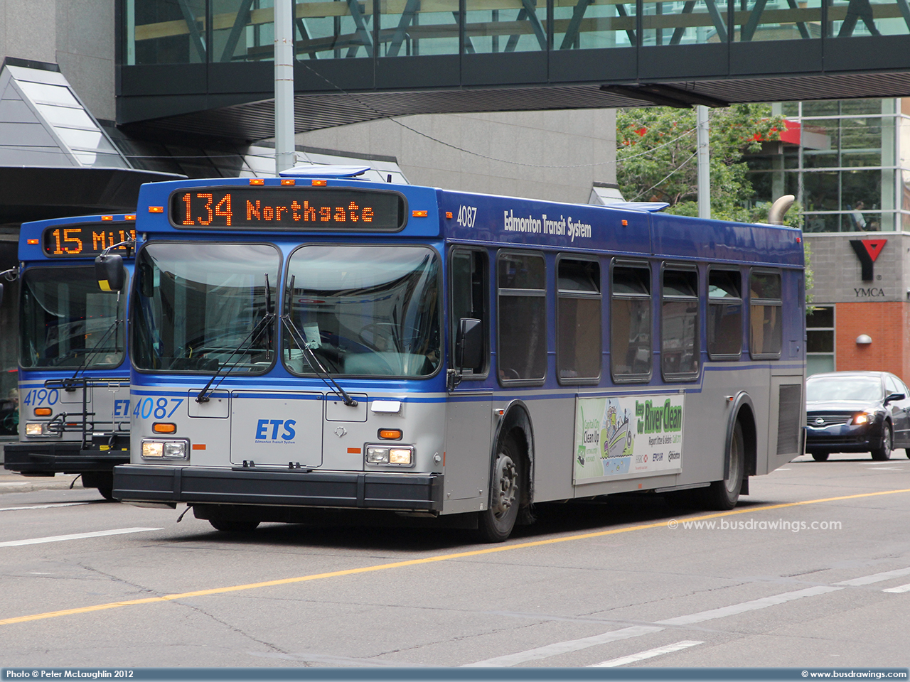 #4087 is seen northbound on 102 Ave. just north of 102 St. while working a route 134 on July 20, 2012. Photo captured by Peter McLaughlin. | |